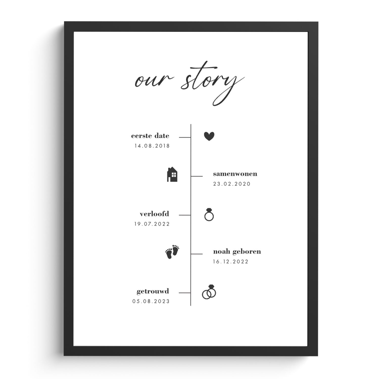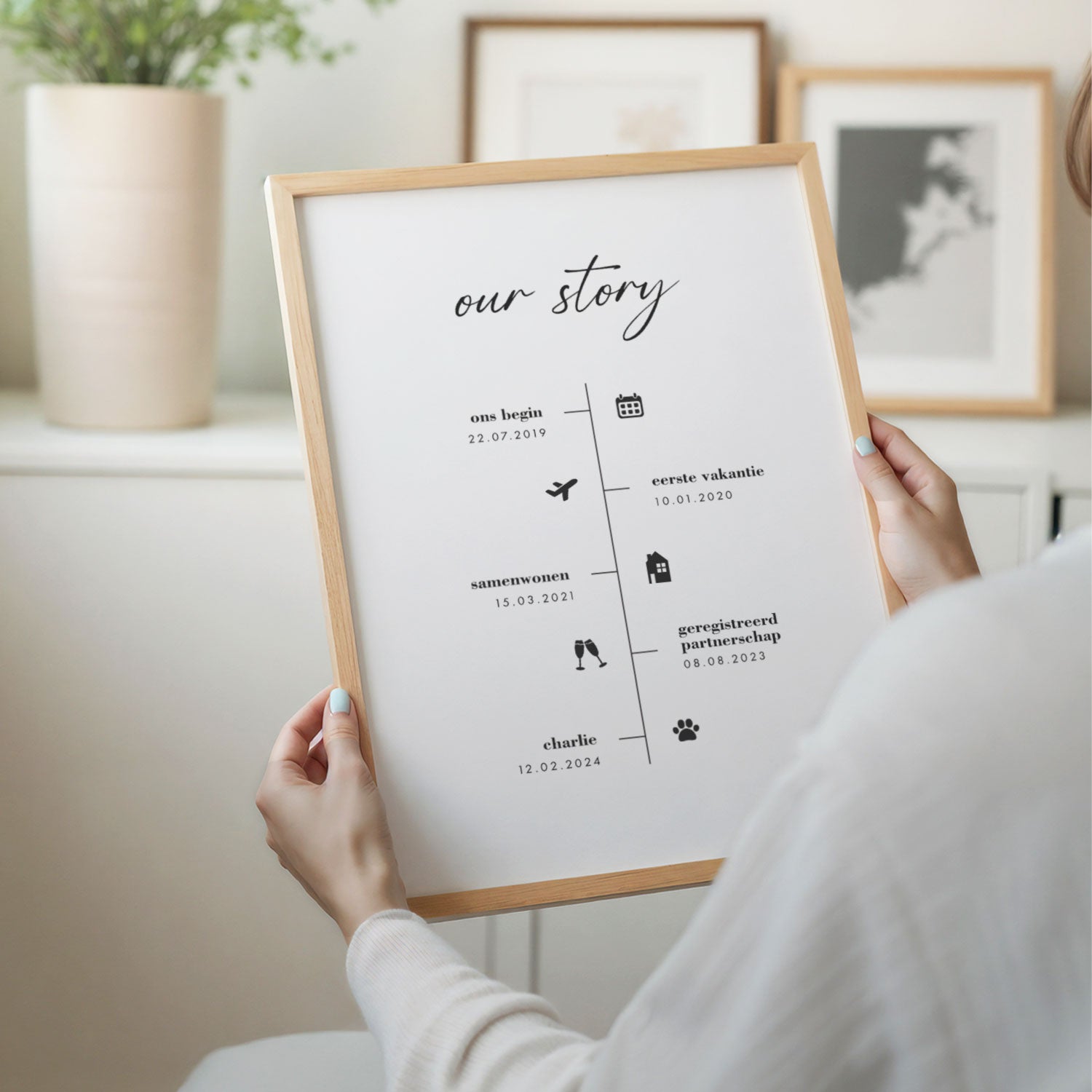 Een gepersonaliseerde poster is een betekenisvol cadeau om iemand te verrassen of een bijzonder moment te vieren. Denk aan een familieposter met alle geboortedatums van het gezin, een geboorteposter met de eerste details van een nieuw leven of een sterrenhemelposter die het moment van ontmoeting laat zien. Of je nu een huwelijkscadeau zoekt, een blijvend geboortegeschenk of een print om een dierbare te herdenken, er is altijd iets dat past bij het verhaal dat je wilt vertellen. De ontwerpen zijn modern, subtiel en stijlvol, waardoor ze moeiteloos in elk interieur passen.