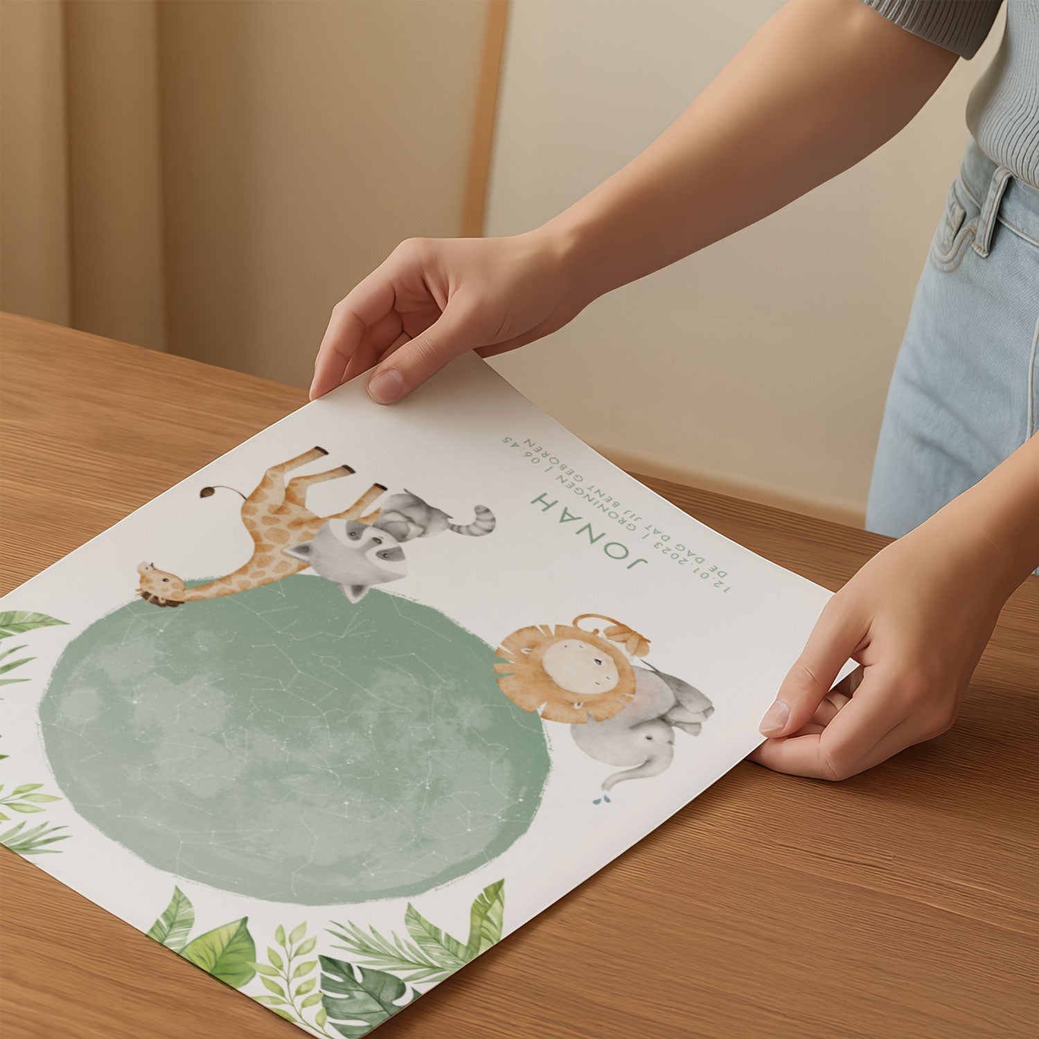 Personnalisez entièrement l'affiche astrologique de naissance selon vos envies : choisissez la couleur, ajoutez le nom de votre enfant, sa date de naissance ou une citation personnelle, et créez un design qui vous ressemble. Cette affiche du ciel nocturne est une œuvre d'art unique pour une chambre d'enfant sur le thème de la jungle, mais aussi un cadeau de naissance spécial et personnel. Un cadeau de maternité original, une carte du ciel qui fera sourire à chaque fois et gardera précieusement la magie de ce jour si particulier.